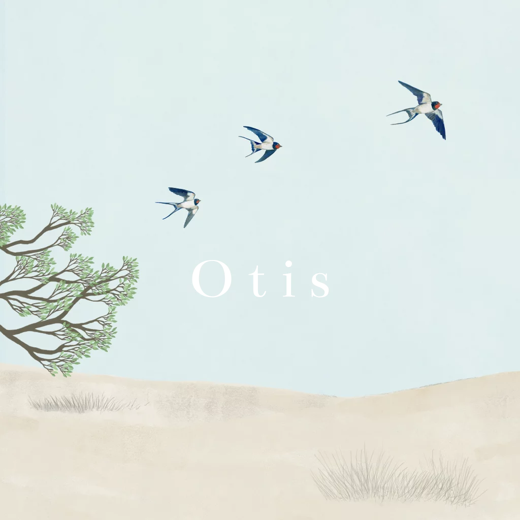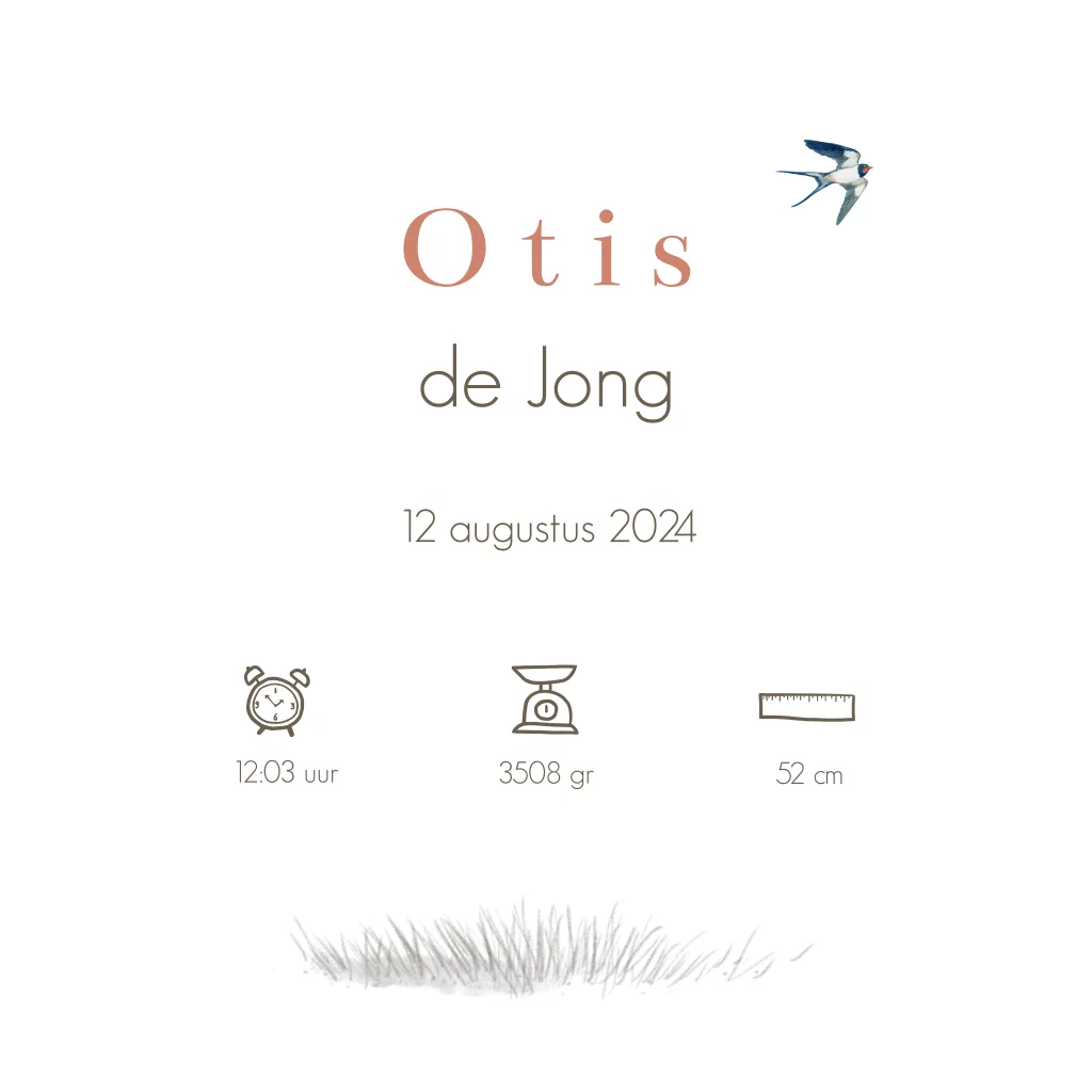 Geboortekaartje met prachtige vliegende boerenzwaluwen. De naam is in foliedruk, maar kan aangepast worden in elke gewenste kleur. Maak dit kaartje helemaal naar wens in de online editor.