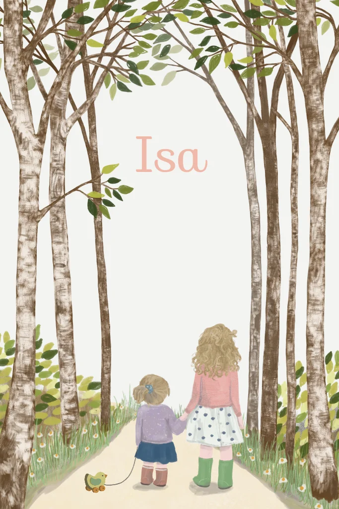 Prachtig geboortekaartje met een grote zus en haar zusje aan het begin van een bospad. Je kunt deze kaart en de illustraties heel makkelijk zelf personaliseren in de editor.