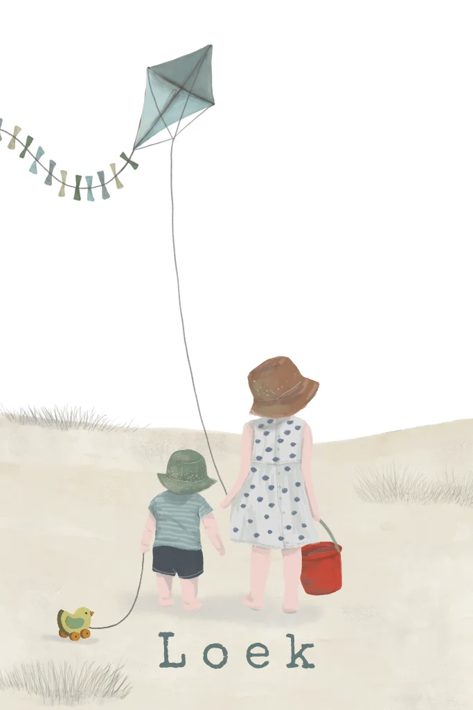Lief zomers geboortekaartje met een trotse grote zus met haar broertje op het strand. Een prachtige aankondiging van de geboorte van je kindje in de zomer. Teksten en kleuren kunnen worden aangepast voor een extra persoonlijk kaartje. Alle illustraties kunnen worden vervangen door andere illustraties uit de uitgebreide beeldbank.