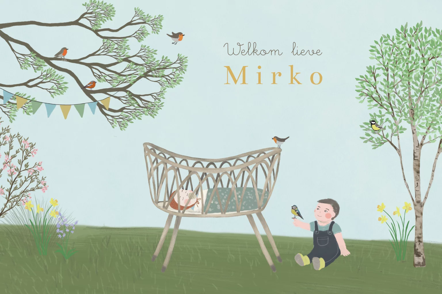 Dit geboortekaartje van een rotan wiegje en een trotse grote broer is een prachtige aankondiging van de geboorte van je tweede kindje in de lente. Teksten en kleuren kunnen worden aangepast voor een extra persoonlijk kaartje. Alle illustraties kunnen worden vervangen door illustraties uit de uitgebreide beeldbank.