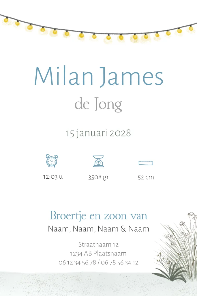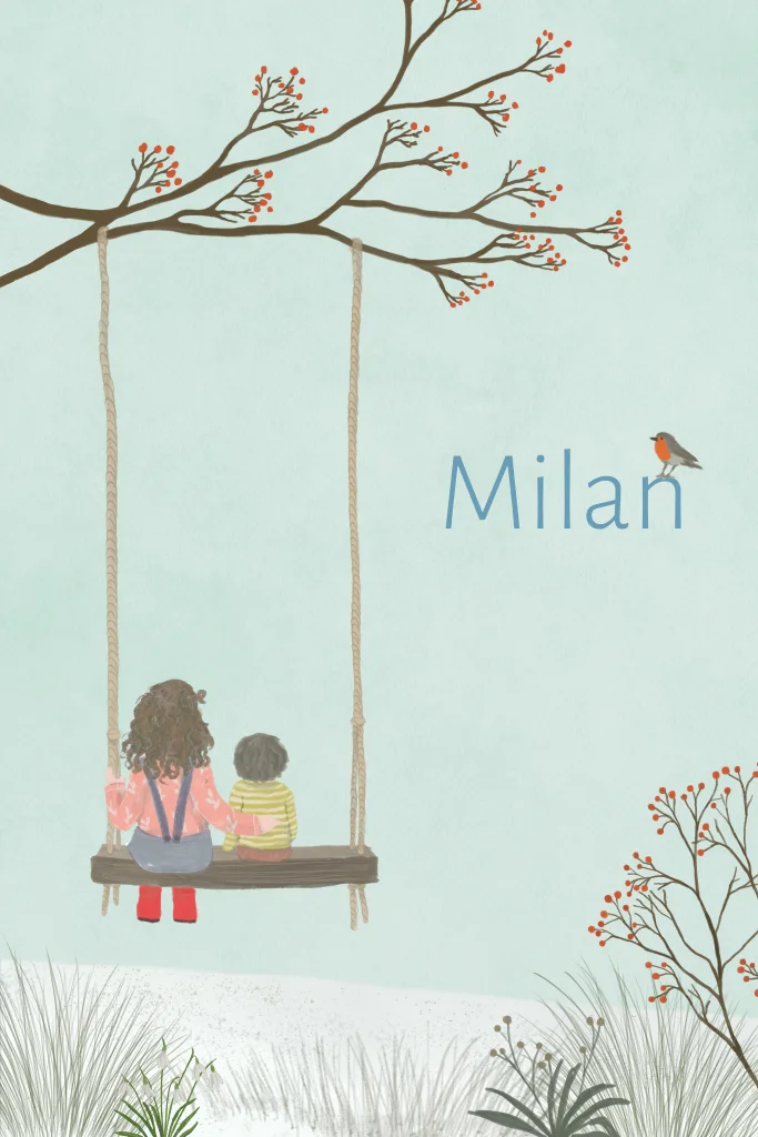 Prachtig geboortekaartje voor een tweede kindje. Een trotse grote zus samen met haar kleine broertje op de schommel in een winterse omgeving. Een prachtige aankondiging van de geboorte van je kindje in de winter. Teksten, illustraties en kleuren kunnen worden aangepast voor een extra persoonlijk kaartje.