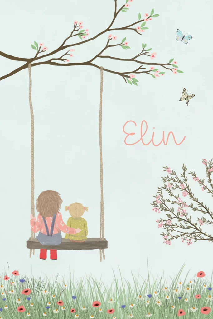 Lief geboortekaartje met een grote zus met haar kleine zusje op de schommel. Een prachtige aankondiging van de geboorte van je tweede kindje in de lente of zomer. Teksten, illustraties en kleuren kunnen worden aangepast voor een extra persoonlijk kaartje.