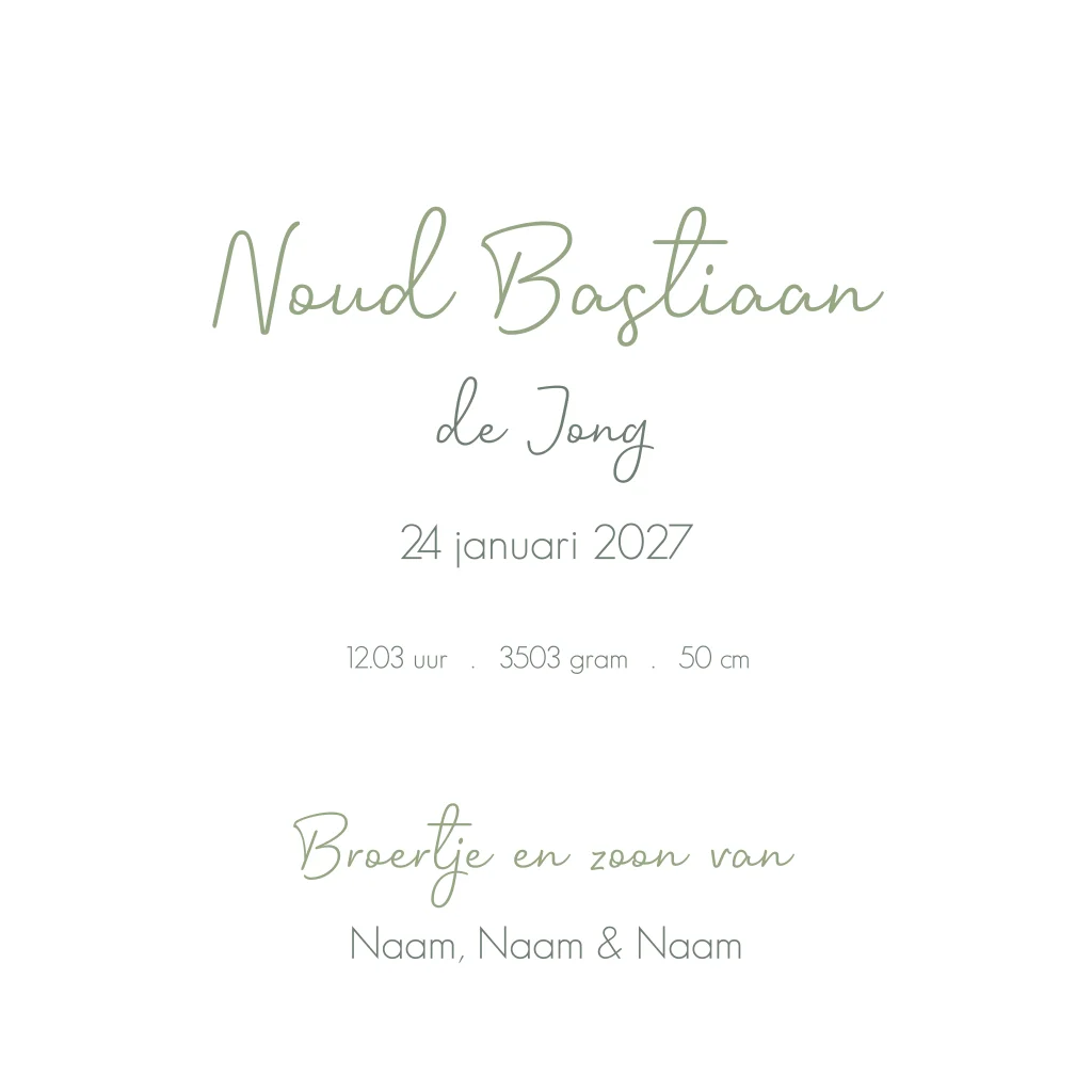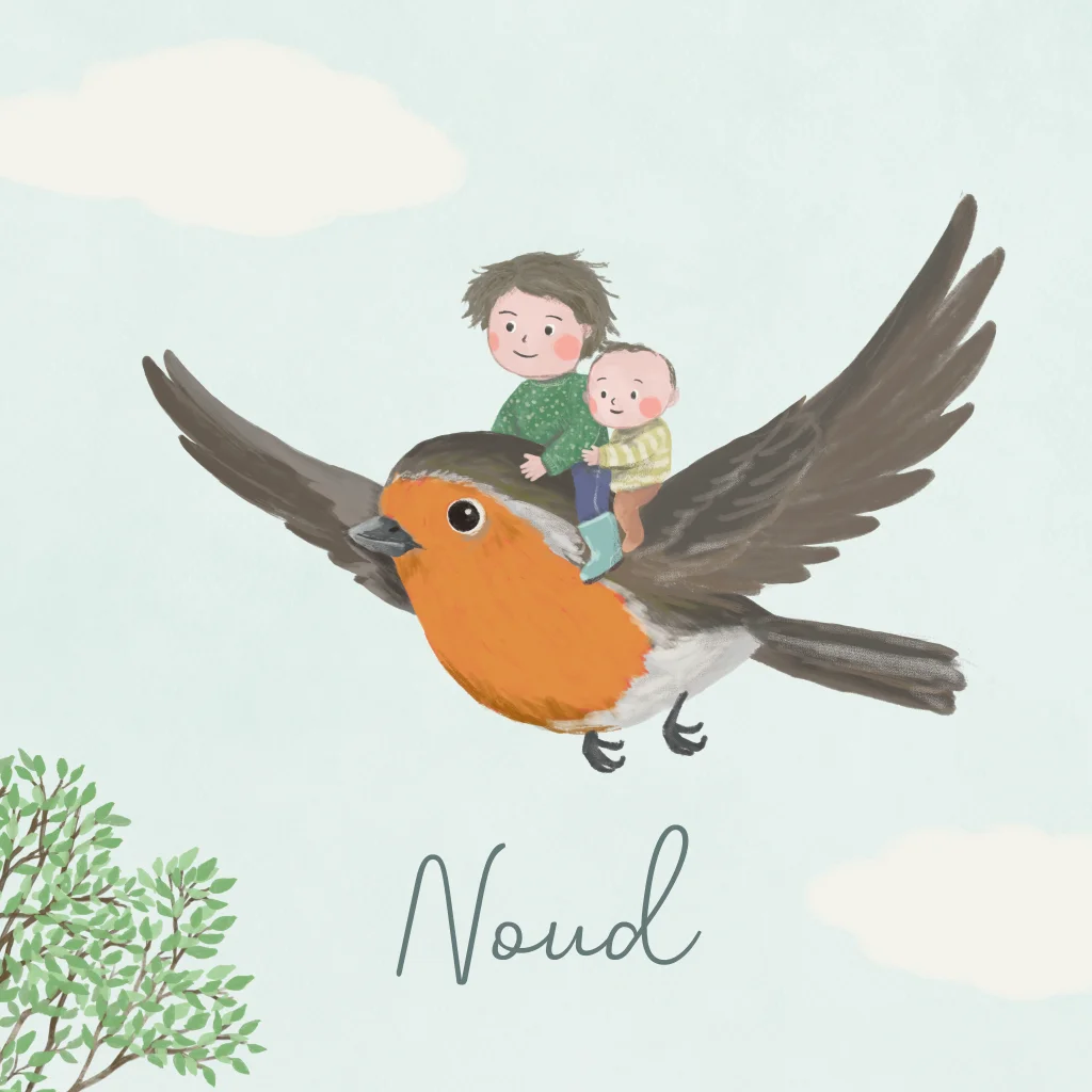 Vrolijk geboortekaartje van een grote broer met zijn kleine broertje op de rug van een roodborstje. Heel leuk voor de geboorte van een tweede kindje. Je past de teksten, illustraties en kleuren heel gemakkelijk aan voor een extra persoonlijk kaartje.