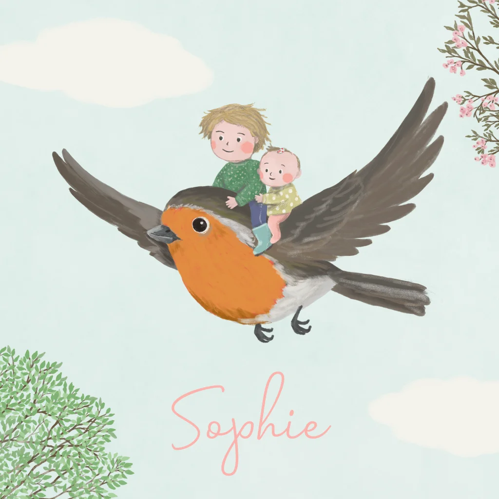 Vrolijk geboortekaartje van een broer met zijn kleine zusje op de rug van een roodborstje. Heel leuk voor de geboorte van een tweede kindje. Je past de teksten, illustraties en kleuren heel gemakkelijk aan voor een extra persoonlijk kaartje.