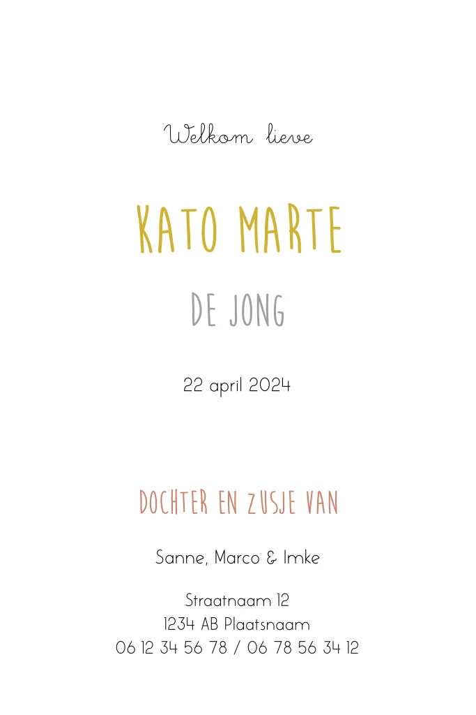 Dit geboortekaartje met een trotse grote zus bij haar kleine zusje of broertje in een rotan wiegje onder een bloesemtak is een prachtige aankondiging van de geboorte van je kindje in de lente. Teksten en kleuren kunnen worden aangepast voor een extra persoonlijk kaartje. Alle illustraties kunnen worden vervangen door illustraties uit de uitgebreide beeldbank.