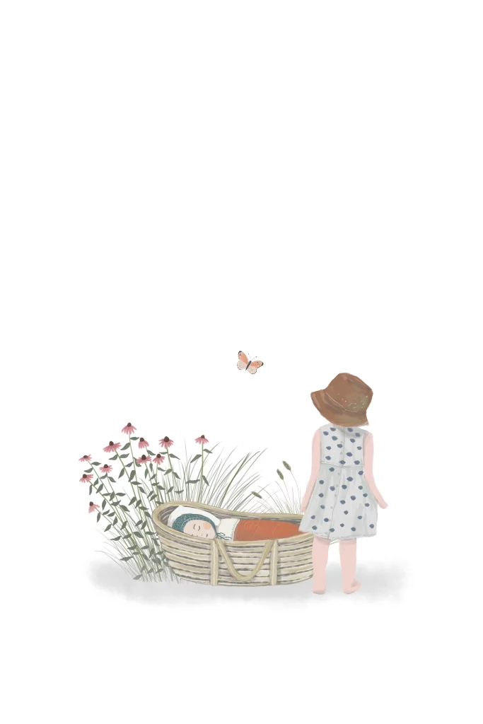 Lieve zomerse poster met een trotse zus bij haar broertje in een Mozes maandje. Teksten, illustraties en kleuren kunnen worden aangepast voor een extra persoonlijk kaartje.