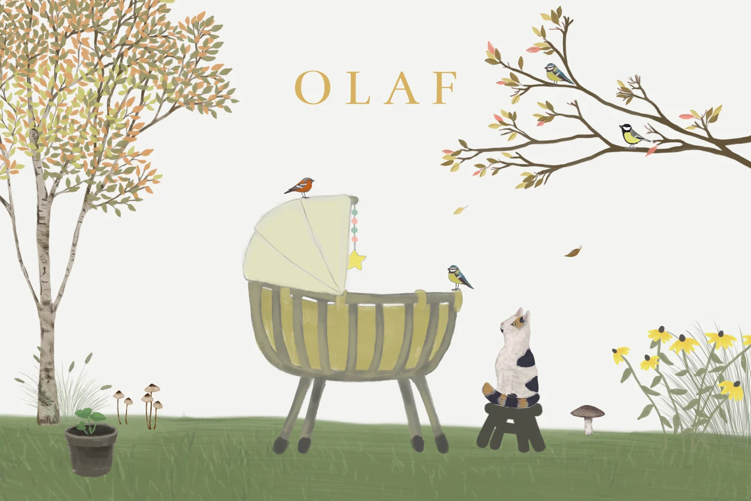 Prachtige poster van een trotse lapjeskat en vogeltjes bij een wiegje. Teksten en illustraties kunnen worden aangepast voor een extra persoonlijke poster.