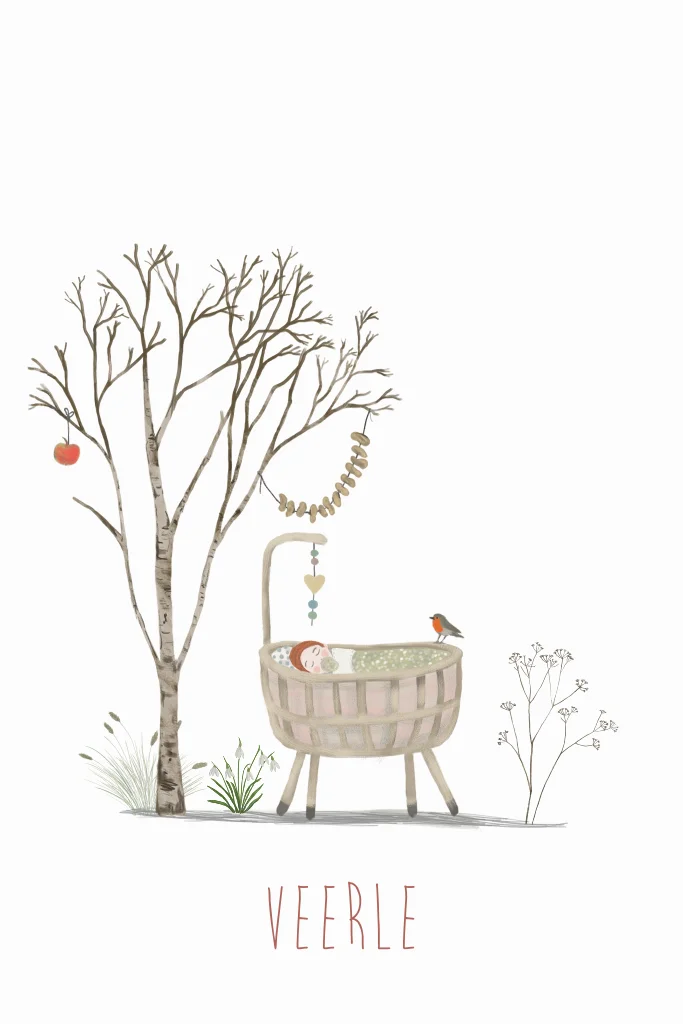 Lieve verfijnde poster met een rotan wiegje met een nieuwsgierig roodborstje in een winterse omgeving. Erg leuk voor op de kinderkamer en als kraamcadeau! Illustraties en teksten kunnen worden aangepast voor een extra persoonlijke poster.