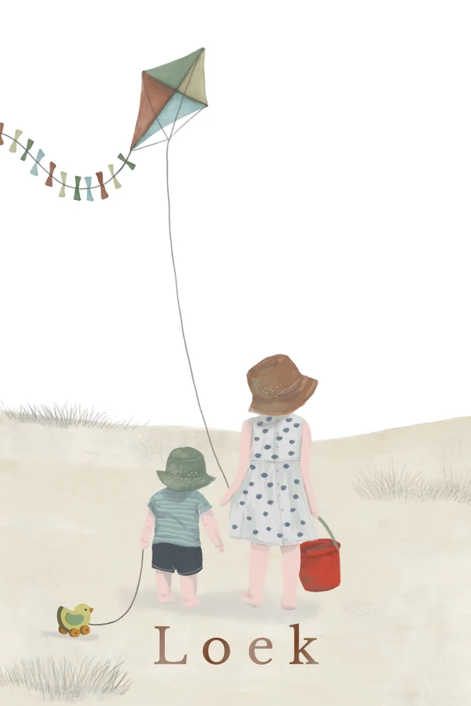 Poster strand vlieger grote zus broertje zomer