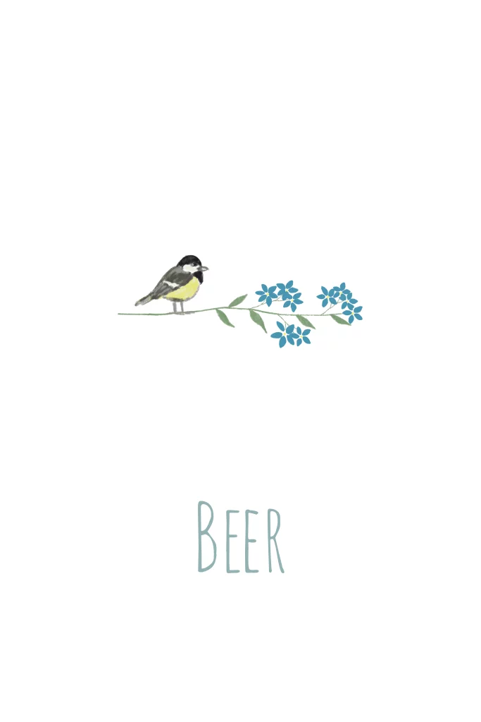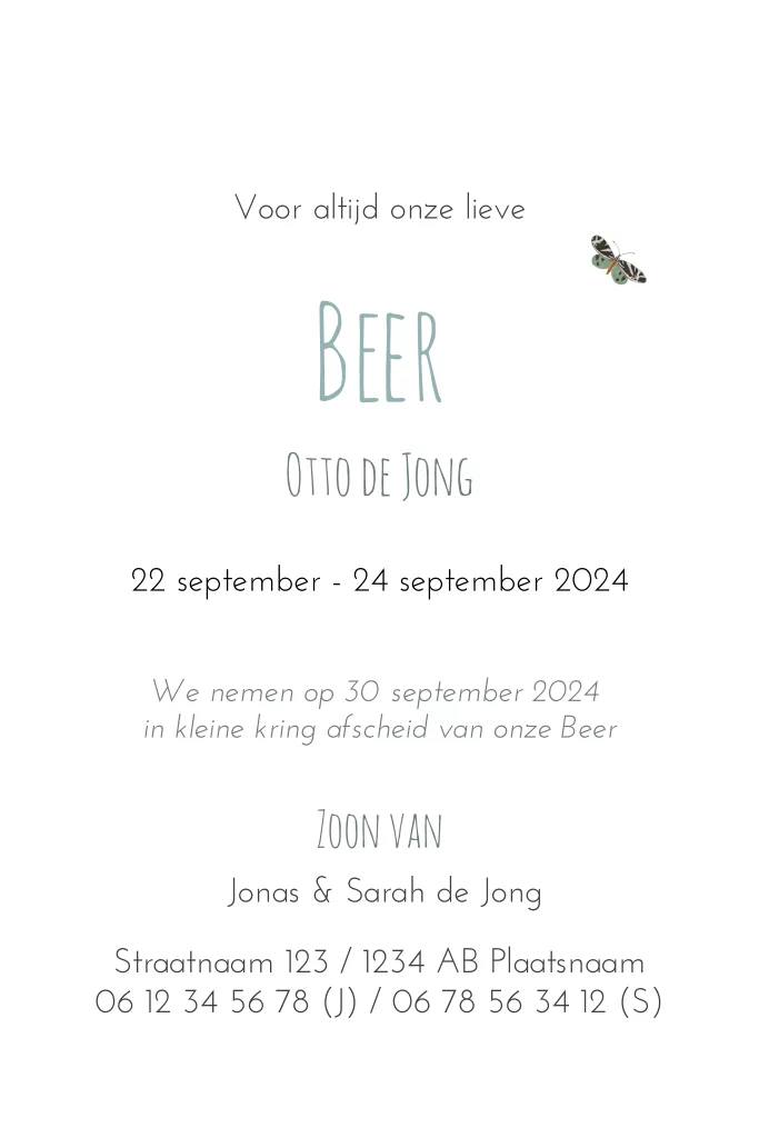 Lief, ingetogen afscheidskaart met een vergeet-me-niet-je en een koolmeesje. De illustraties zijn digitaal geschilderd.