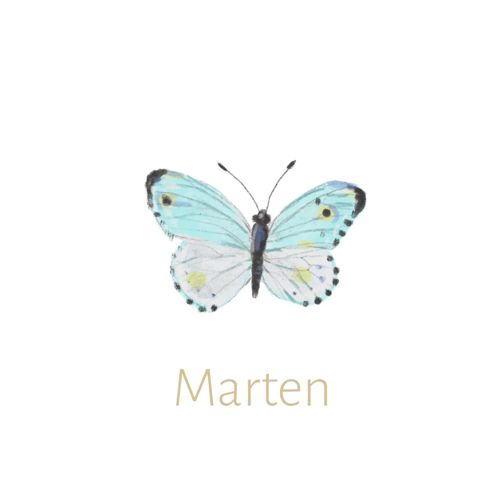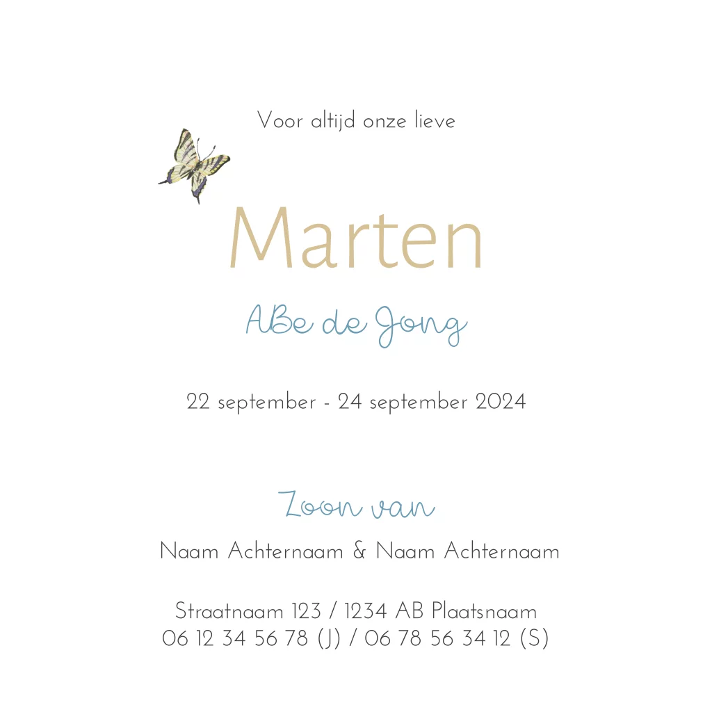 Lieve rouwkaart met vlindertjes voor het afscheid van je kindje. De originele illustraties zijn digitaal geschilderd. Pas kleuren en lettertypes aan, om de kaart naar wens te maken.