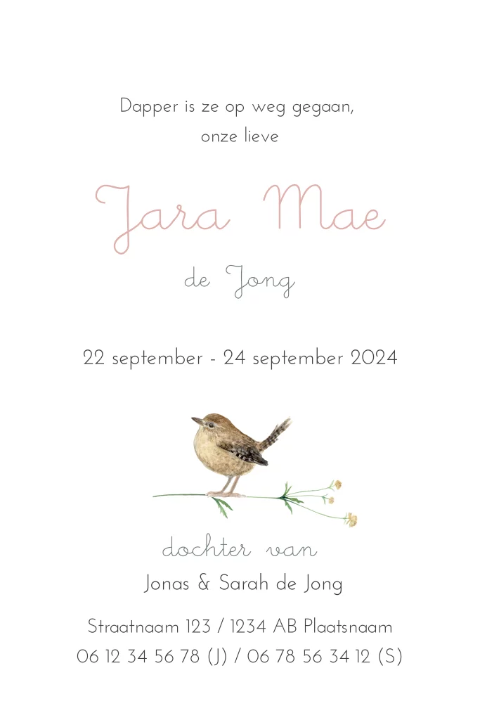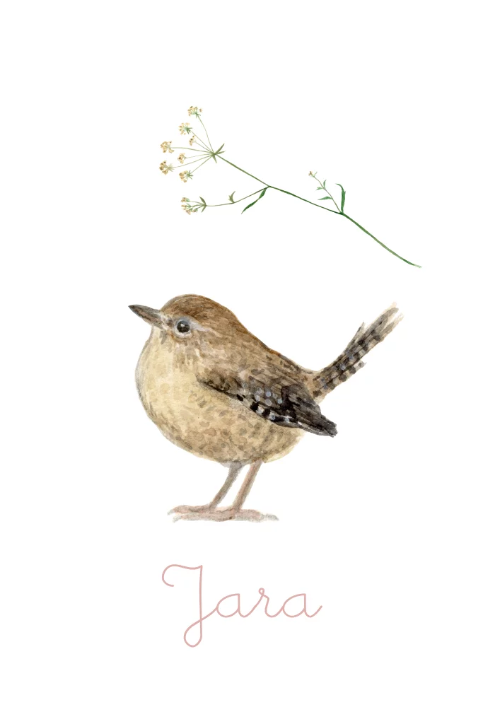 Lieve rouwkaart voor het afscheid van je kindje. Het winterkoninkje en de bloemen zijn geschilderd met aquarel en gouache.