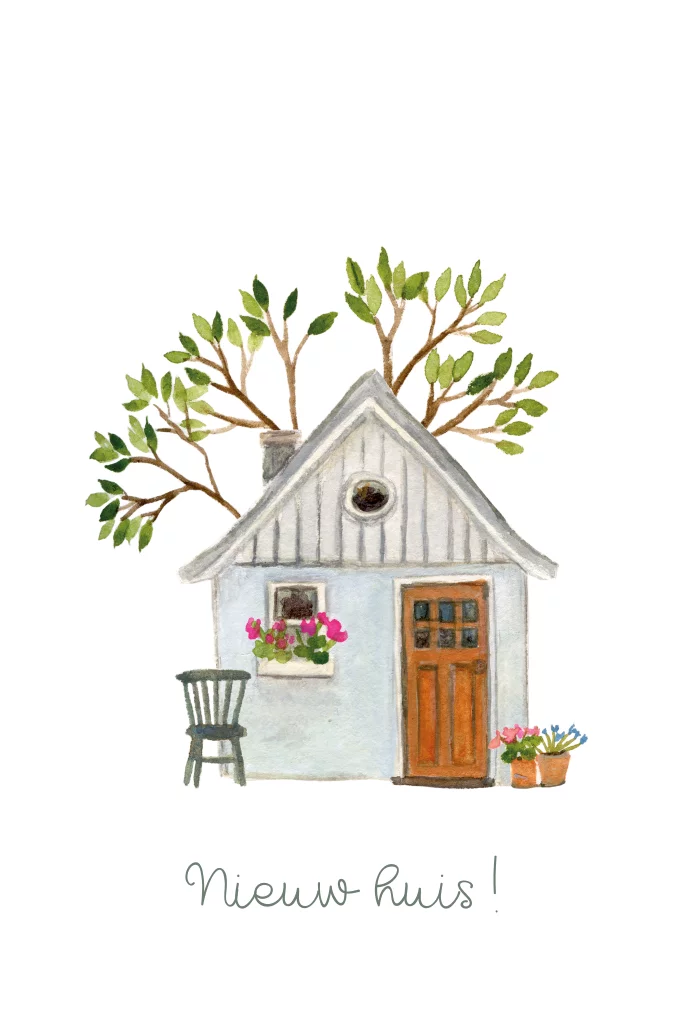 Prachtige wenskaart met illustraties geschilderd met gouache. Voor iemand met een nieuw huis of voor als verhuisbericht als je zelf gaat verhuizen.